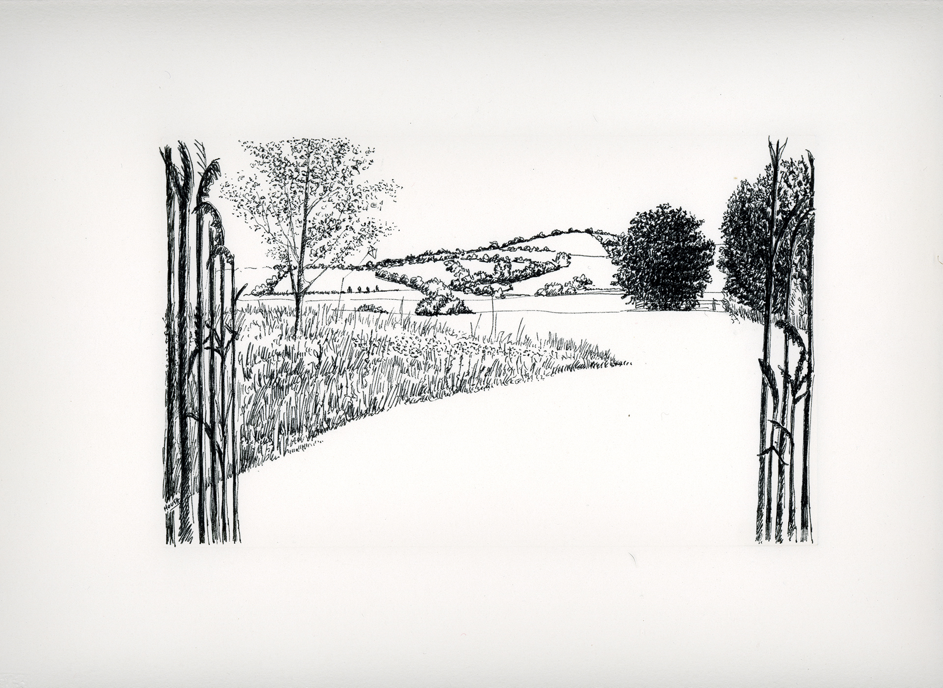 A hand bound sketchbook commissioned by Big Fish as a birthday present for a client, containing twelve pen and ink drawings. Hand bound in green buckram with a leather spine, gold blocking on the cover, marbled endpapers and contained within a protective solander box.